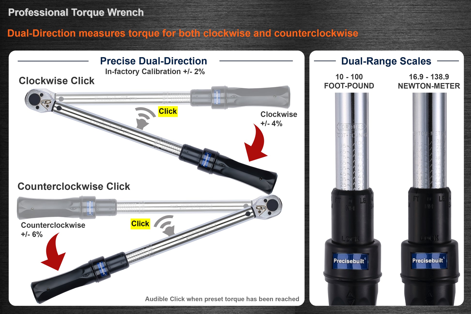 3/8" Drive 10-100 ft-lb (16.9-138.9 Nm) Dual-Direction Click Professional Torque Wrench