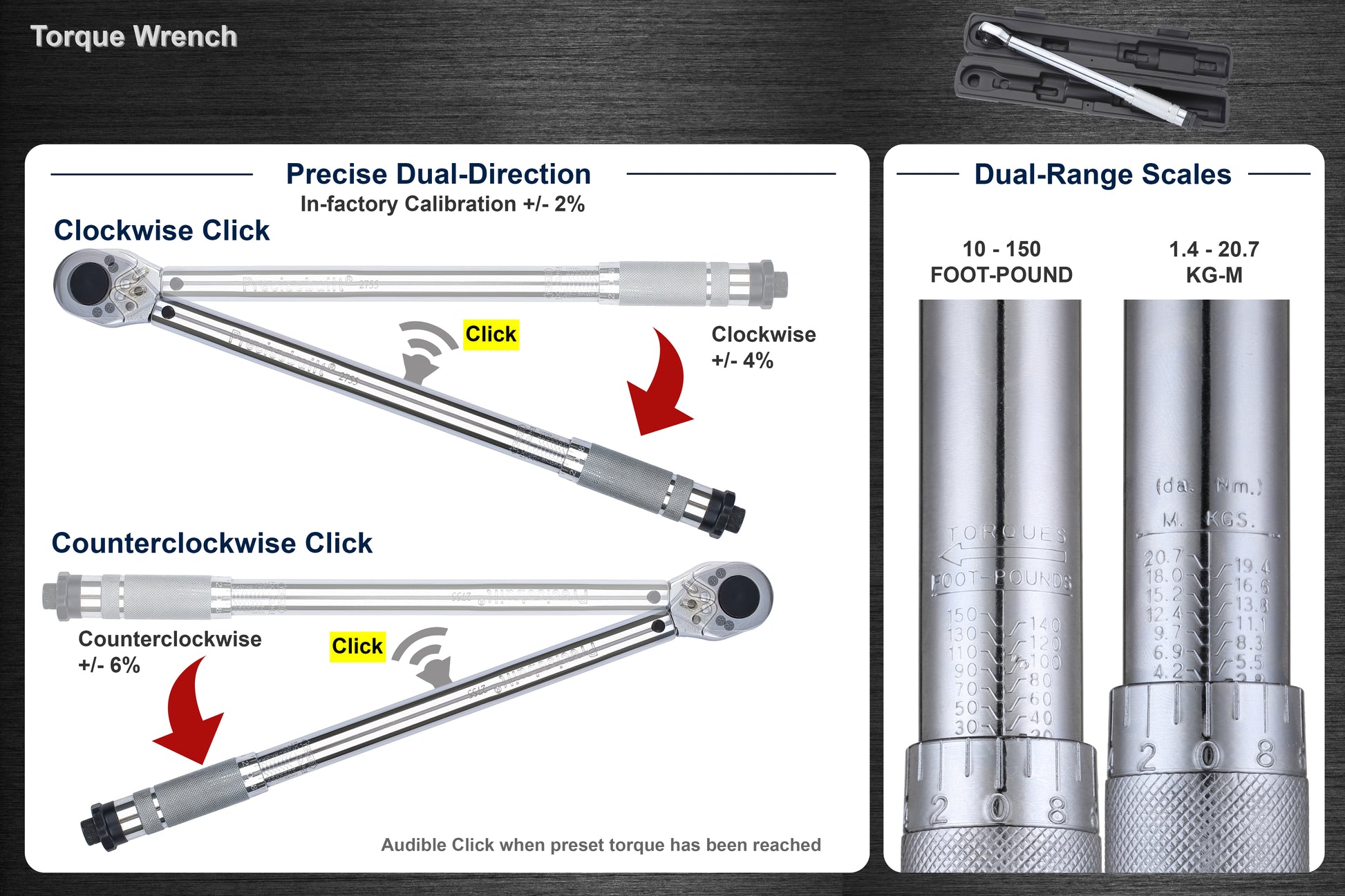 1/2" Drive 10-150 ft-lb (1.4-20.7 kg-m) Dual-Direction Click Torque Wrench